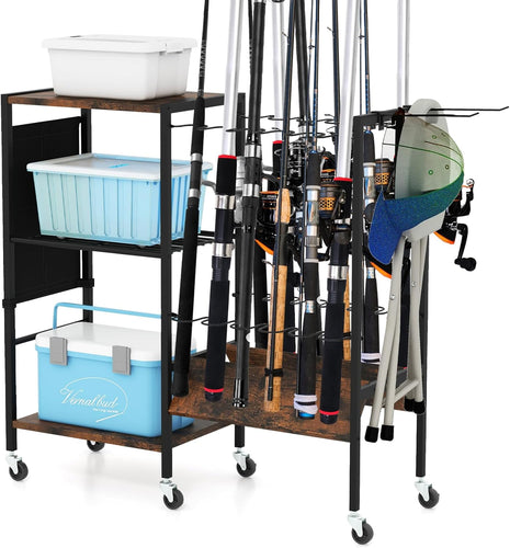 Fishing Rod Rack, Fishing Gear Tackle Cart with Lockable Wheels & Storage Bag, Fishing Rod Holder Equipment Organizers