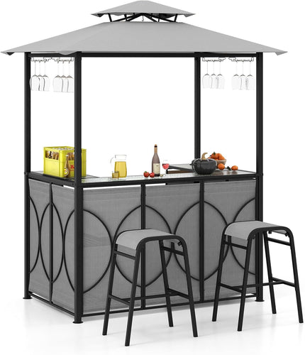Grill Gazebo and 2 Bar Stools with Tempered Glass Bar Table for Patio Poolside Garden