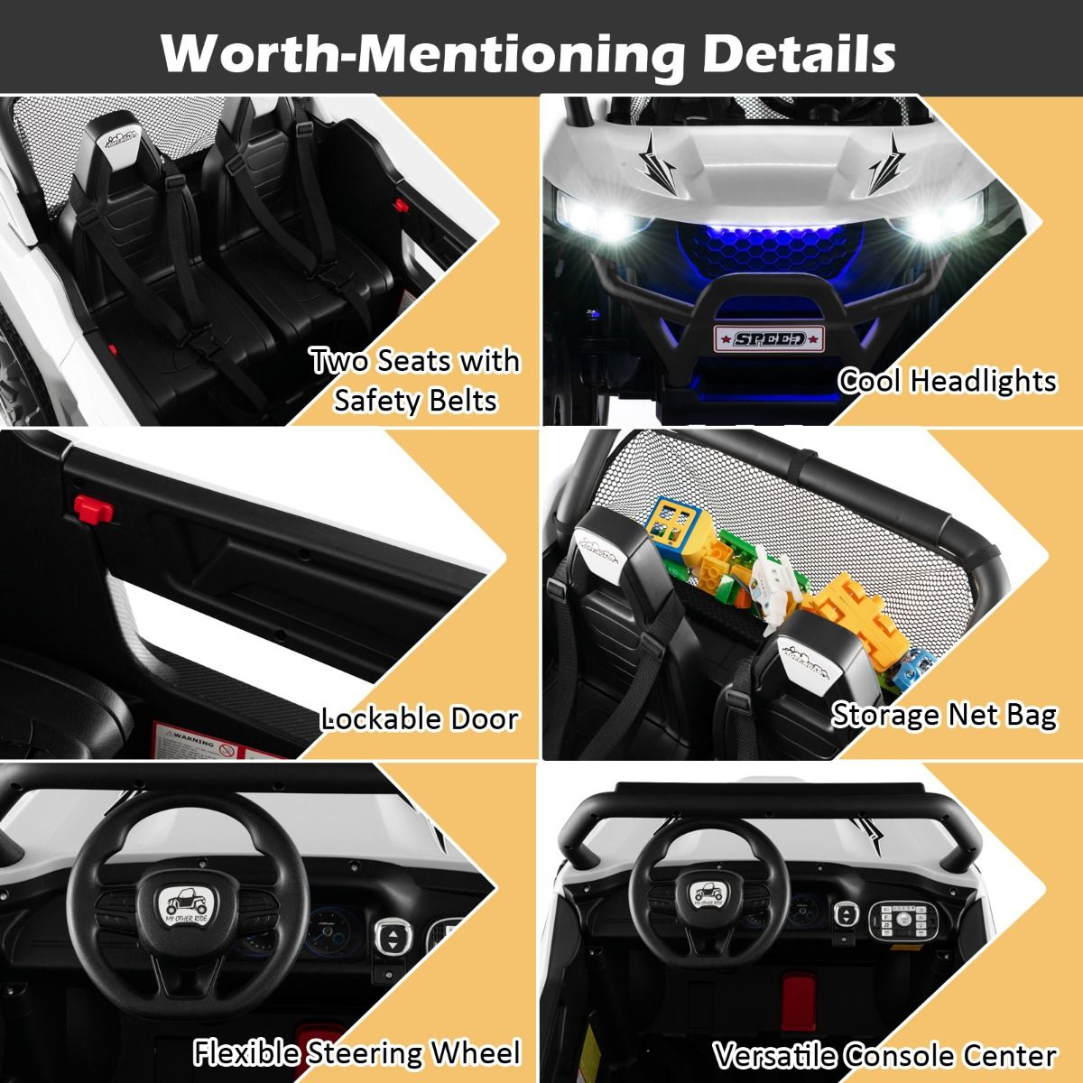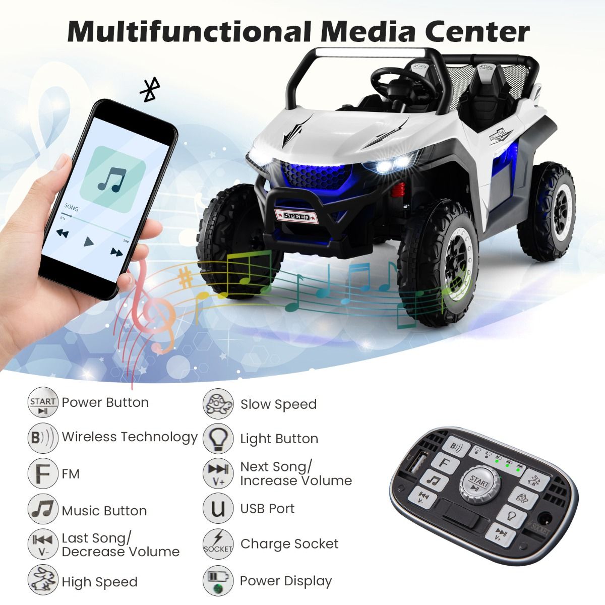 Joyful Music and Attractive Lights: Featuring wireless technology, music/pause button, USB port, FM button and volume adjustment, this 2-seater ride on UTV allows kids to enjoy music while driving. Besides, the cool headlights & ambient lights offer a fantastic & realistic driving experience.