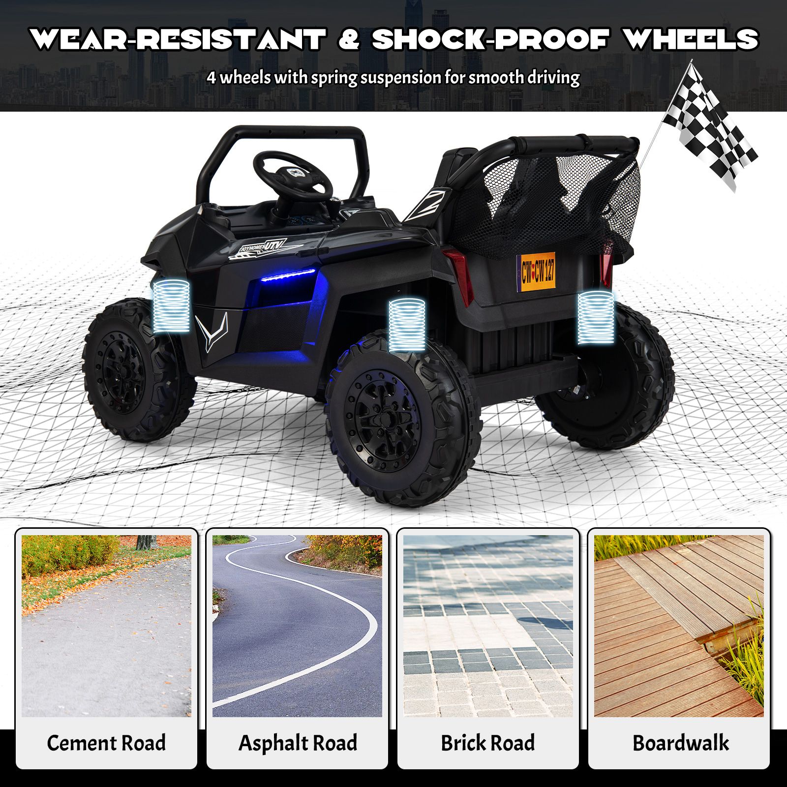 Smooth Riding on Different Roads: Equipped with 4 wear-resistant 33cm large wheels, this kids ride on UTV is suitable for various roads, such as brick road, asphalt road, cement road and boardwalk. Moreover, there are 2 shock-absorbing springs to ensure smooth and safe driving.