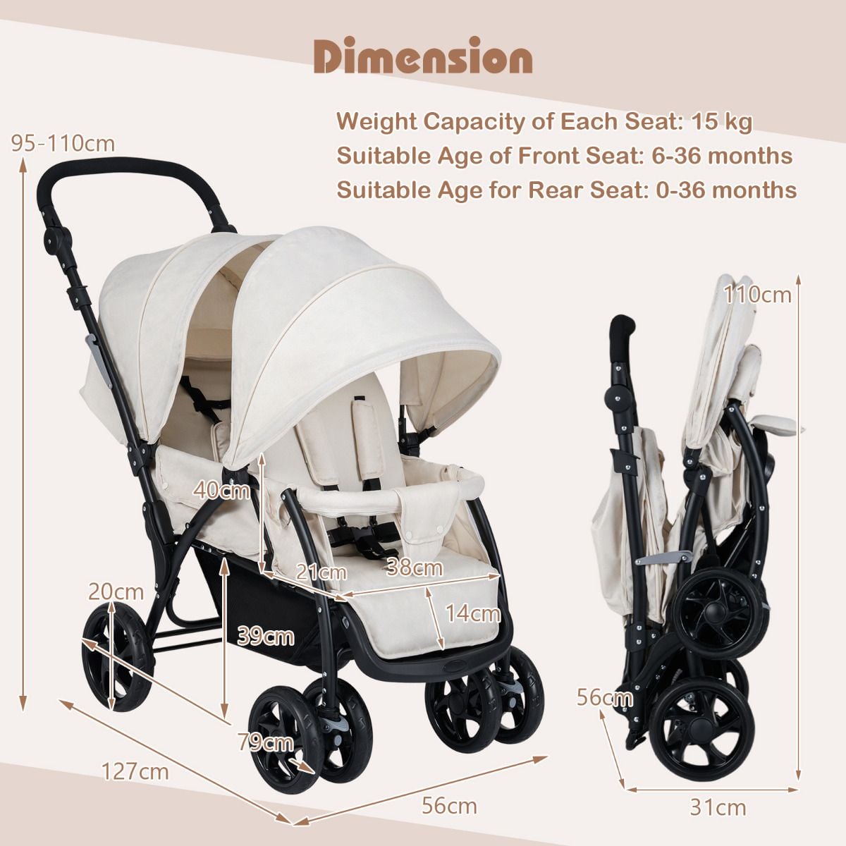 Double Pushchair: Designed with 2 seats, one in front of the other, the front seat is suitable for a child aged 6-36 months, while the rear seat is suitable from birth to 36 months. The maximum weight for each seat is 15kg.