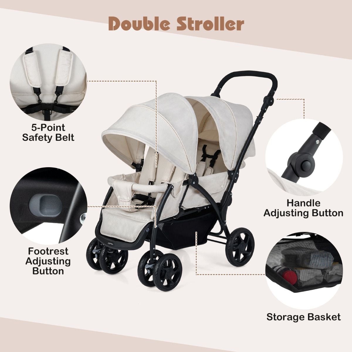 Safety Wheels and 5-point Safety Belts: Universal swivelled front wheels, easily control direction and safety. The rear wheel has a connecting rod and brakes in one step. Each seat is equipped with a 5-point seat belt, keeping your baby secure in the seat.