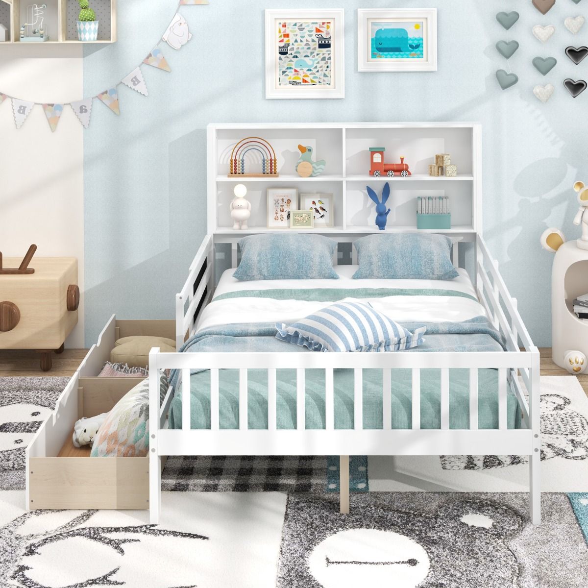 Storage Drawers and Bookcase: 2 storage drawers on wheels help you organize clothing, toys, or books easily. Besides, the integrated bookcase encourages organization and easy access to bedtime stories or study materials, fostering a love for reading and learning.