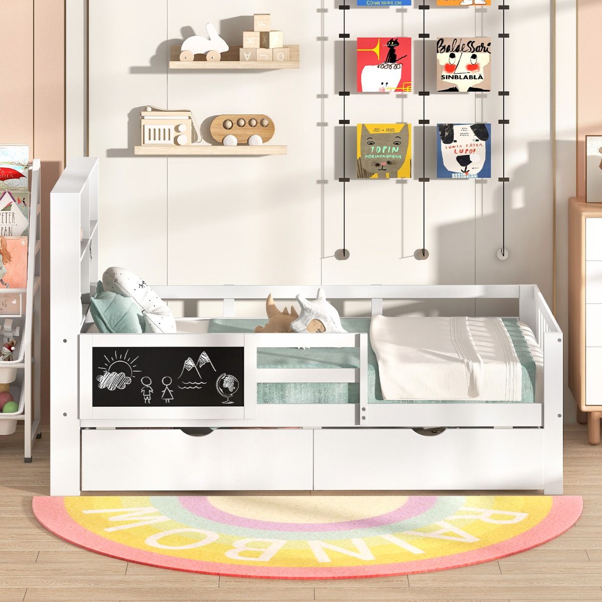 The integrated bookcase and 2 under-bed storage drawers maximize space utilization, making room organization a breeze. This versatile bed is not only a restful place but also a creative space for kids or teens, enhanced by the blackboard feature. Crafted from solid wood and reinforced with sturdy slats, this bed frame offers supreme durability and stability. Designed with an idea of safety, the bed frame features full-length guardrails for peace of mind. It is designed to cater to growing children’s needs but also crafted for longevity.